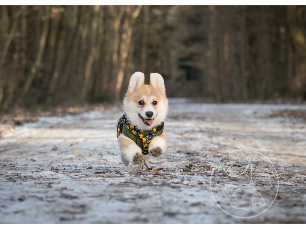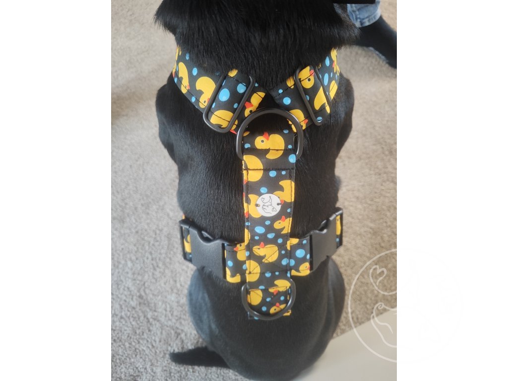 Přes hlavu psa se postroj navlékne a okolo hrudníku se zapne na 2 přezky.