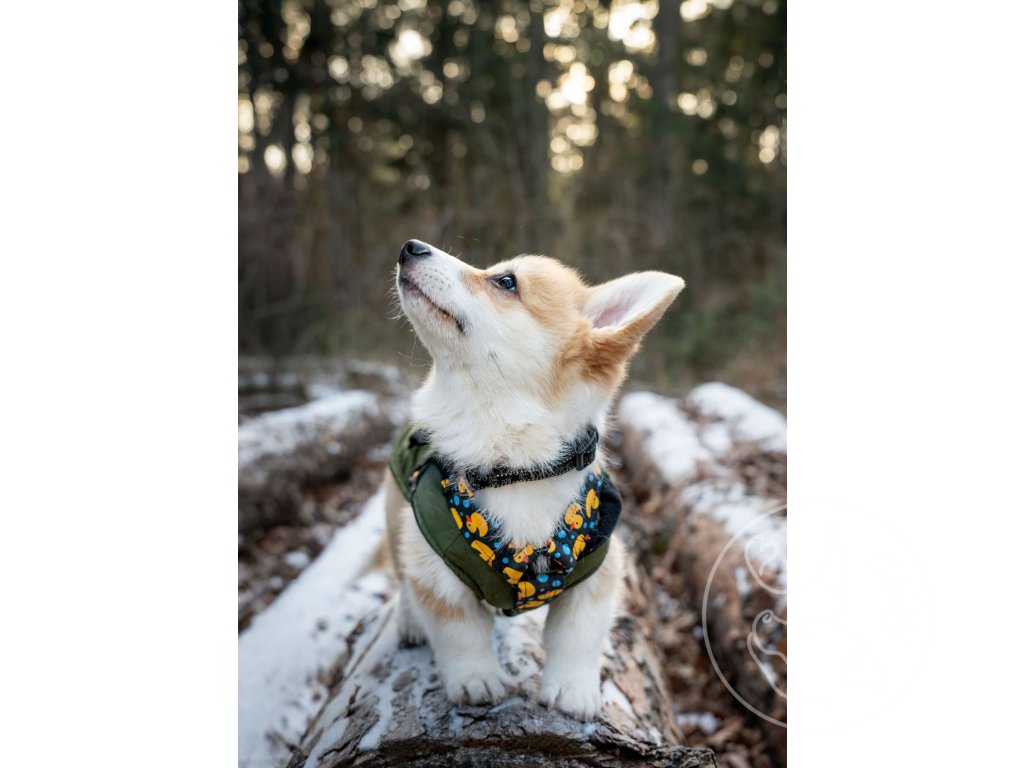 Přes hlavu psa se postroj navlékne a okolo hrudníku se zapne na 2 přezky.