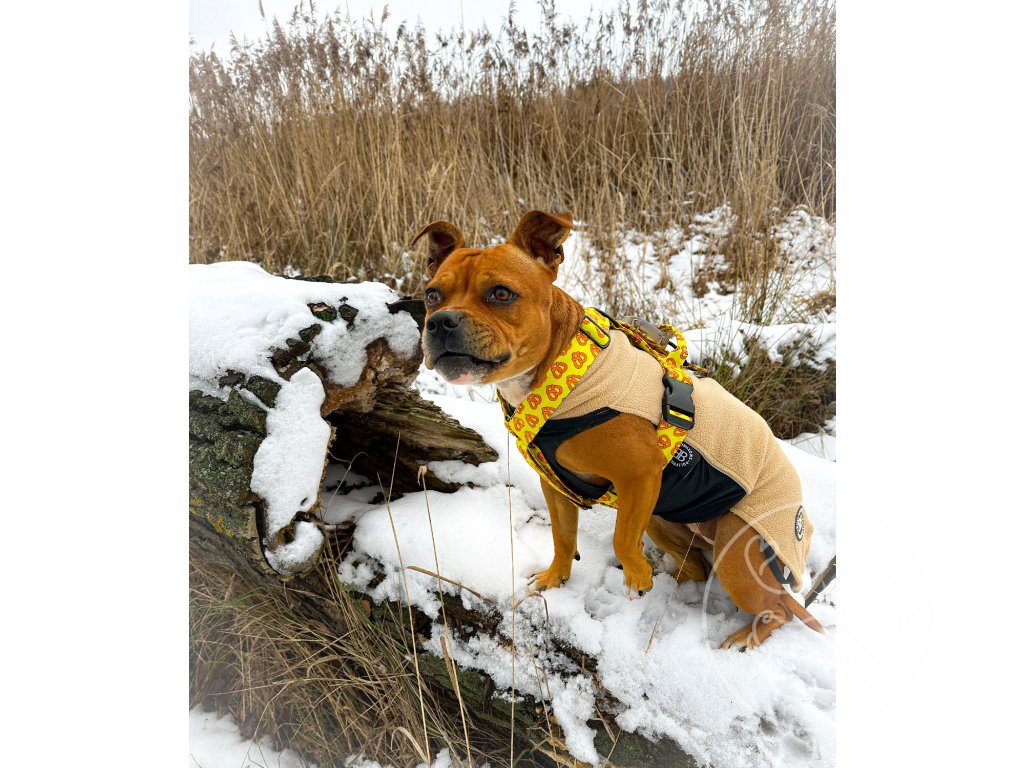Přes hlavu psa se postroj navlékne a okolo hrudníku se zapne na 2 přezky.