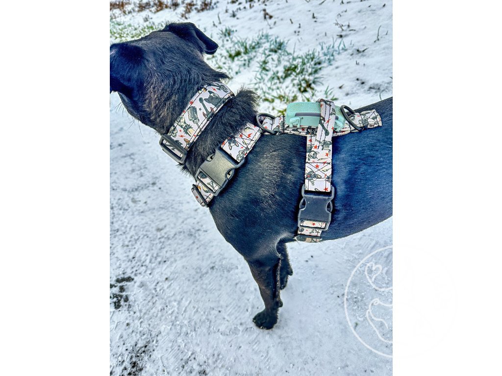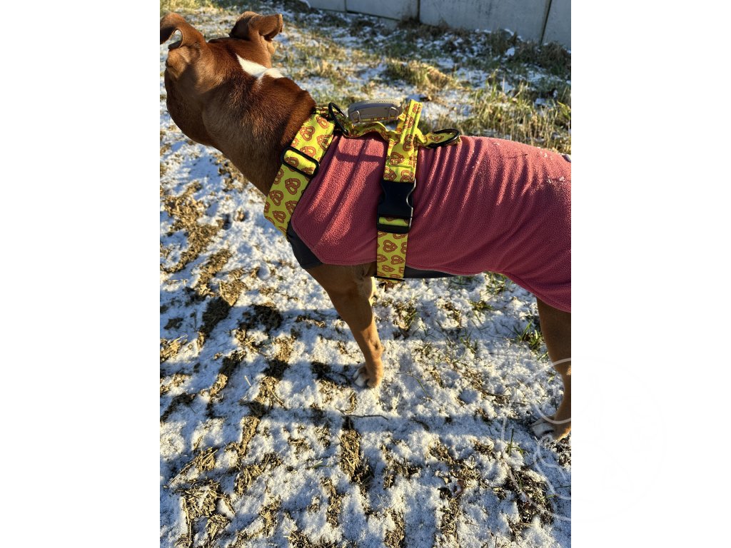 Přes hlavu psa se postroj navlékne a okolo hrudníku se zapne na 2 přezky.