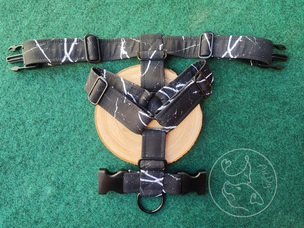 Posuvné okolo krku, hrudníku a ze spod hrudníku. Na zádech psa je pevná délka.